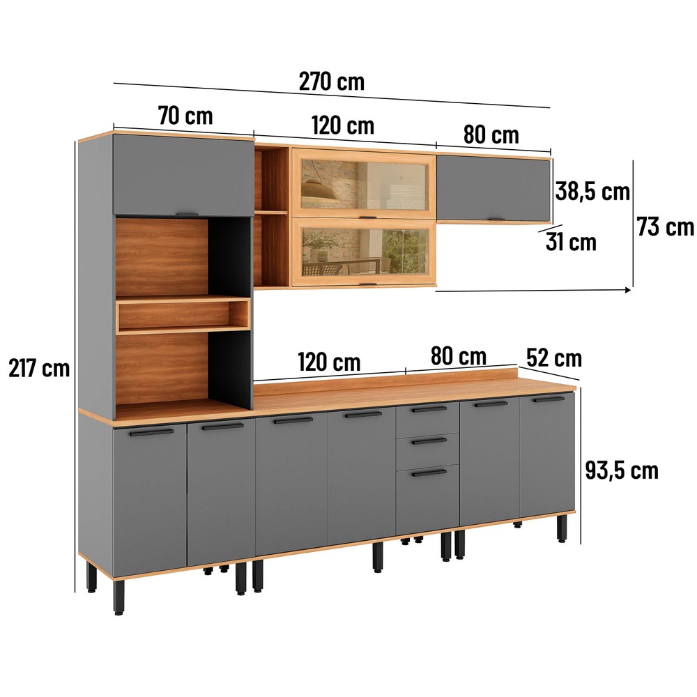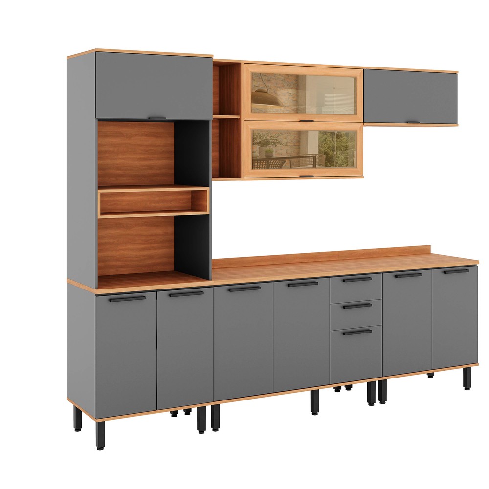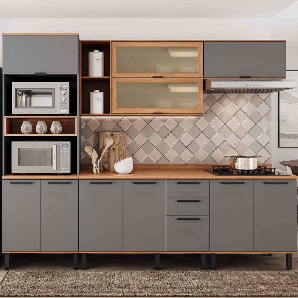 Armário de Cozinha Completa Castanha 2700MM Torre Quente 5 Peças - Cinza/Freijó