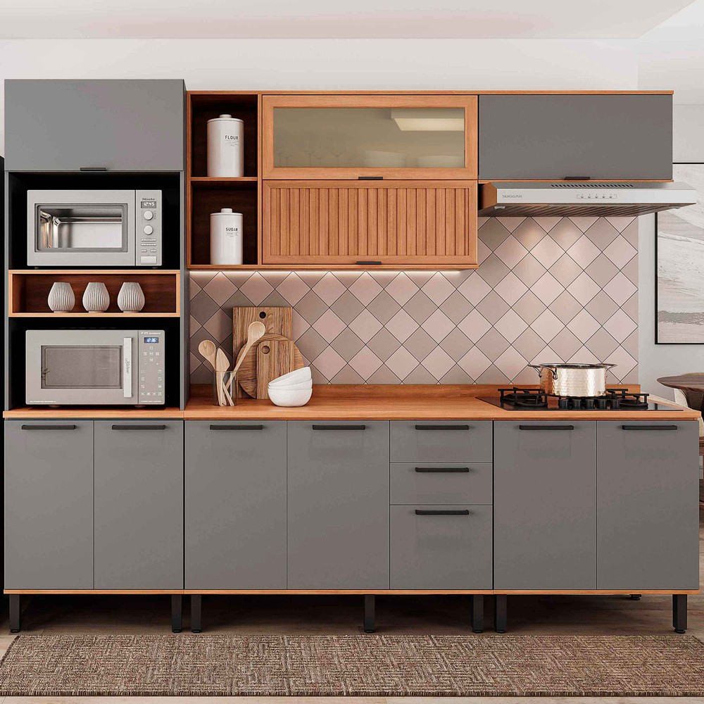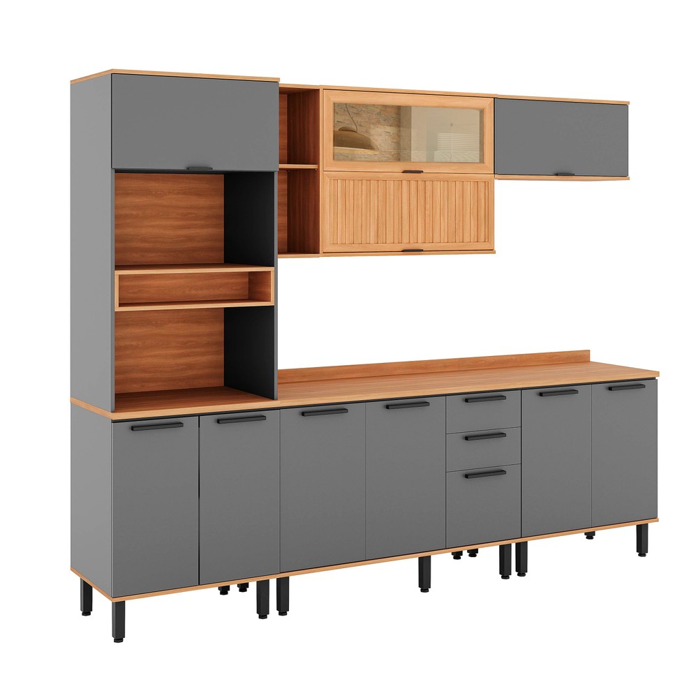 Armário de Cozinha Completa Castanha 2700MM Torre Quente 5 Peças - Cinza/Freijó