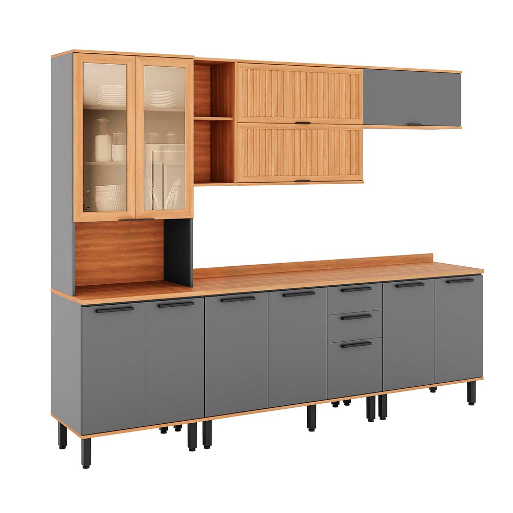 Armário de Cozinha Completo Castanha 2700MM Com Ripado e Vidro - Cinza/Freijó