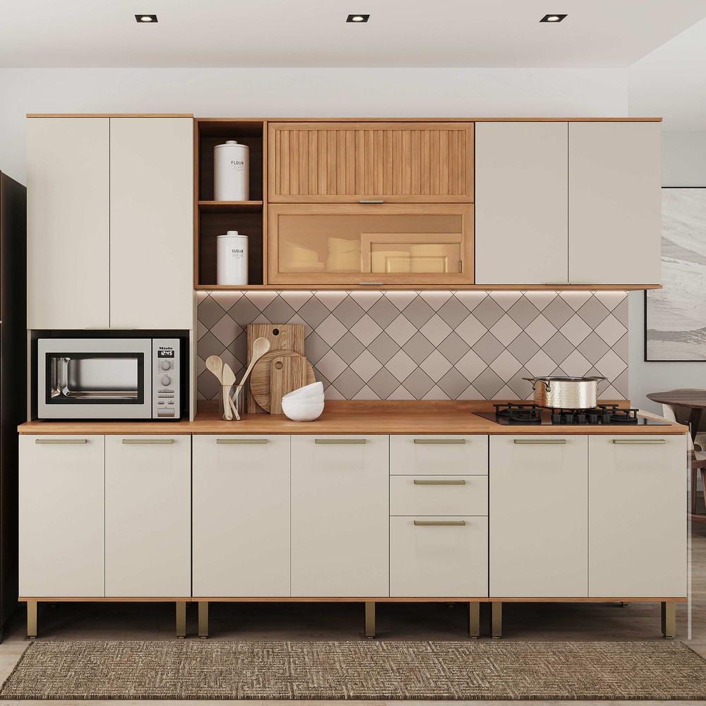 Cozinha Castanha 5 Peças 1 Porta Ripada e 1 Porta com Vidro para Micro-Ondas - Arenas/Freijó