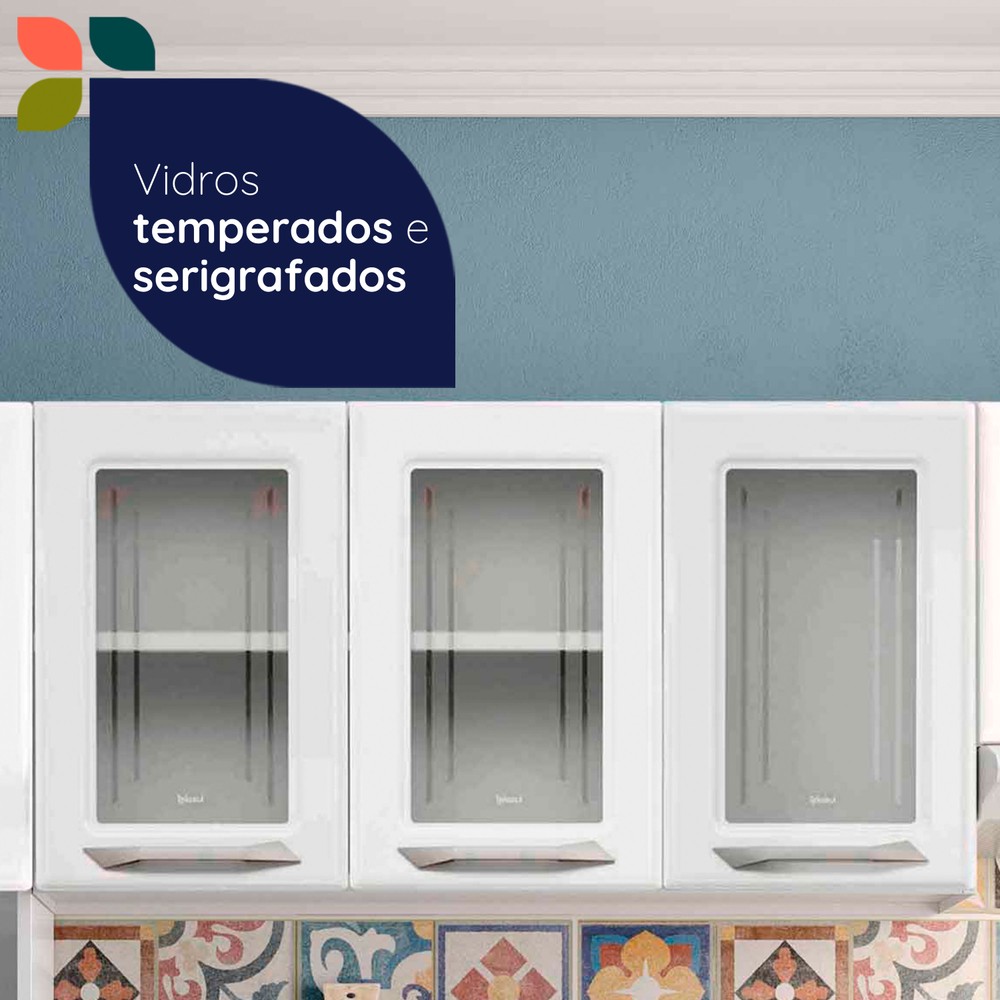 Vidros bonitos e seguros: Os vidros possem delicadas serigrafias alinhadas aos desenhos de portas. Para mais segurança, eles são temperados.
