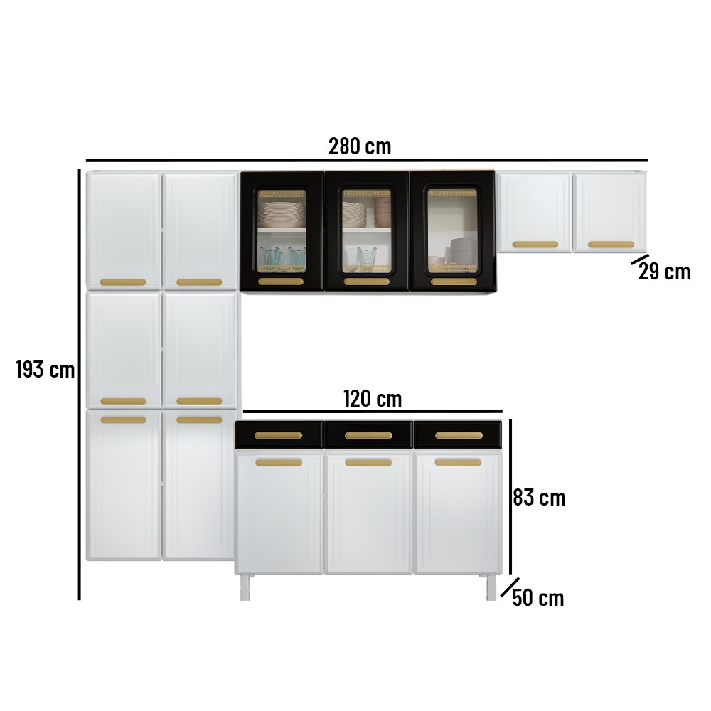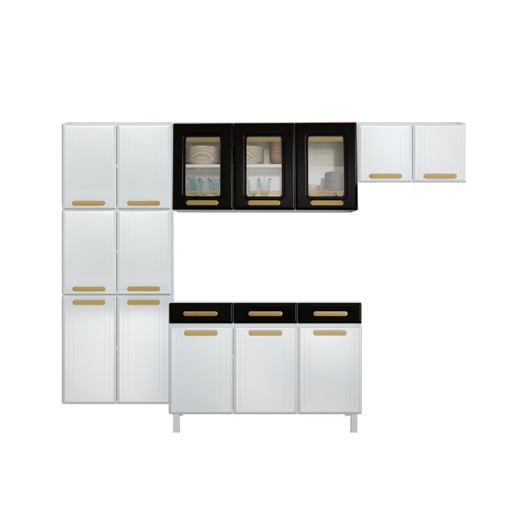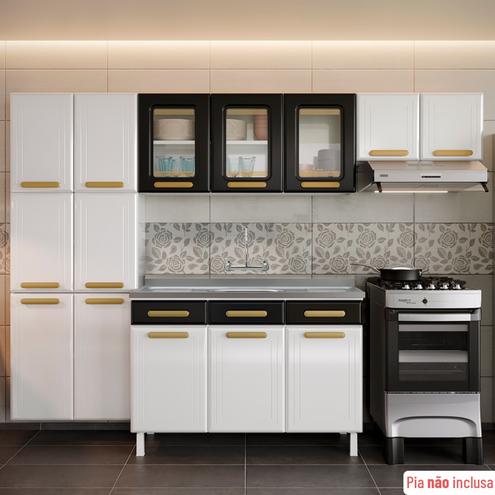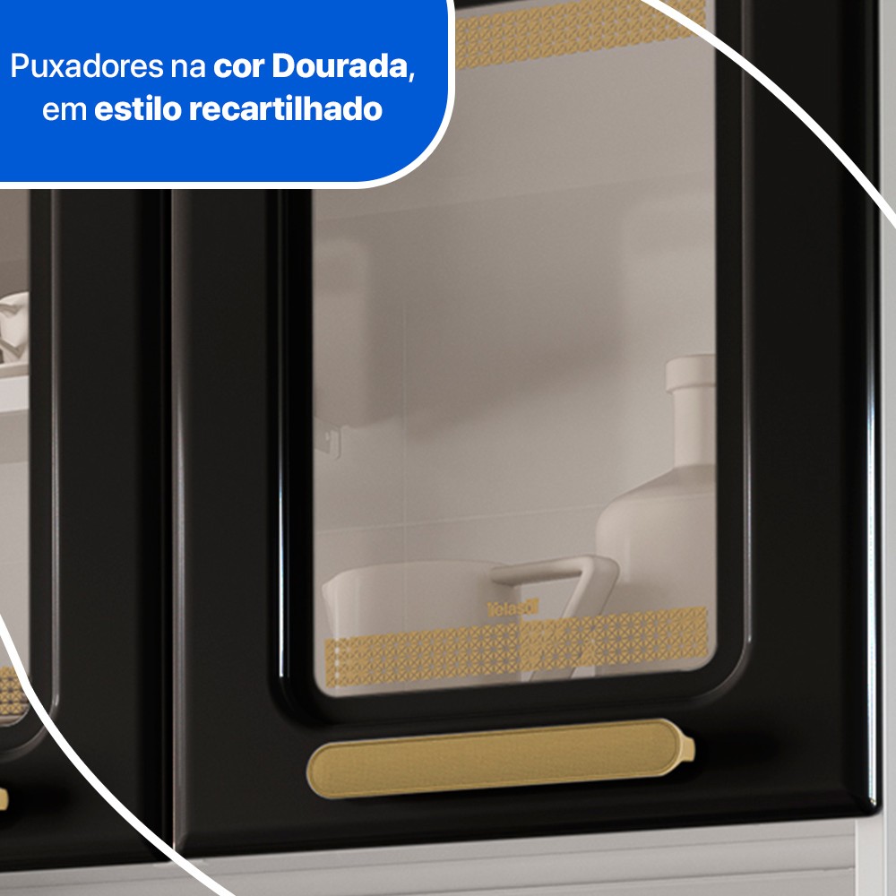 A Cozinha Ágata oferece durabilidade e beleza excepcionais para o coração da sua casa. Desenvolvida com componentes de qualidade, proporciona excelente espaço de armazenamento e módulos com compartimentos funcionais. Nessa composição, é formada por paneleiro duplo, armário triplo, armário duplo e balcão para pia. Os vidros temperados da Cozinha Ágata apresentam elegantes serigrafias que harmonizam perfeitamente com o desenho das portas e os puxadores dourados – esses possuem um acabamento recartilhado muito moderno e estiloso. O balcão para pia é uma peça coringa para qualquer cozinha – aqui, ele é muito espaçoso e equipado com gavetas que deslizam de modo eficiente, graças às corrediças metálicas. Totalmente fabricada em aço, a cozinha é revestida por um acabamento eletrostático e anticorrosivo, o que garante uma durabilidade excepcional. Faça a escolha certa para o ambiente mais querido da sua casa: escolha a Cozinha Ágata e desfrute de qualidade e estilo inigualáveis.