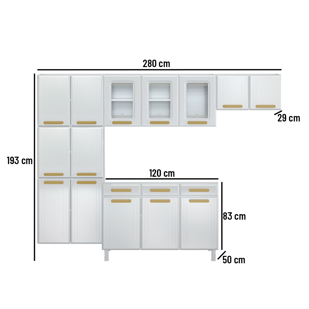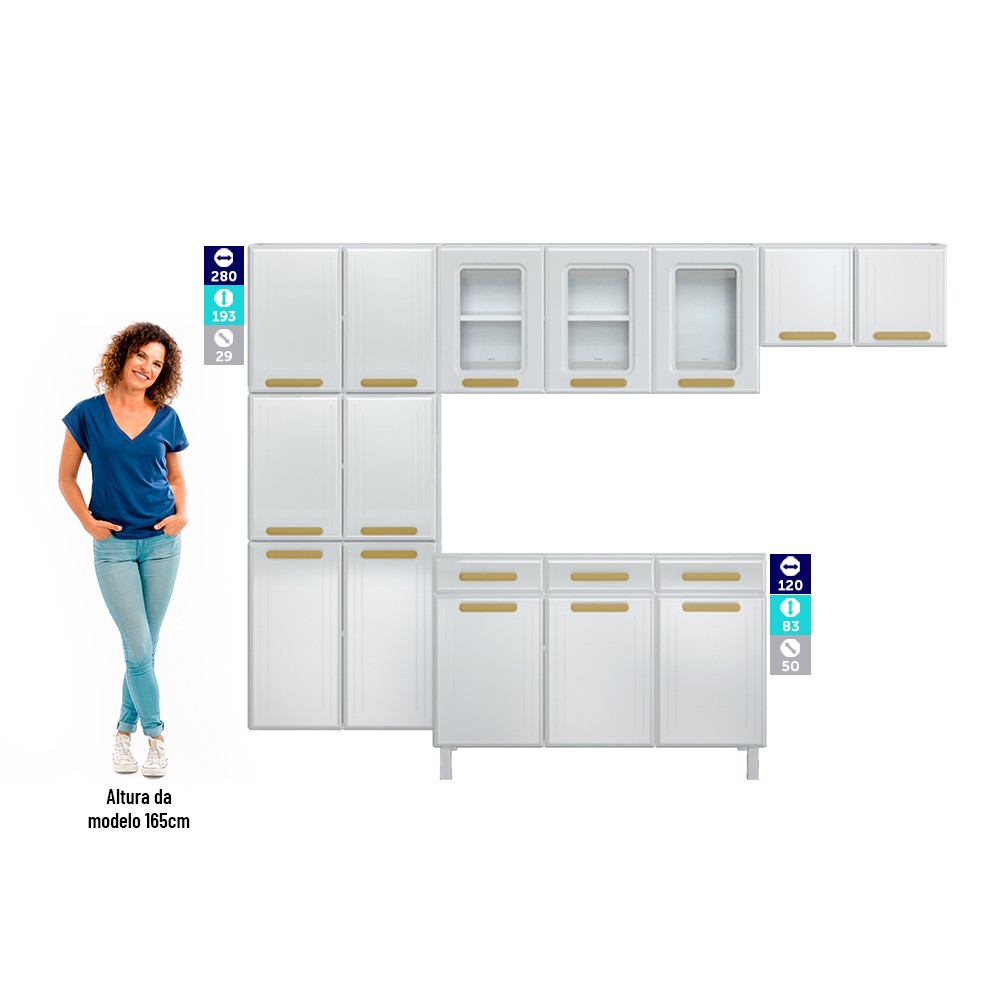 A Cozinha Ágata oferece durabilidade e beleza excepcionais para o coração da sua casa. Desenvolvida com componentes de qualidade, proporciona excelente espaço de armazenamento e módulos com compartimentos funcionais. Nessa composição, é formada por paneleiro duplo, armário triplo, armário duplo e balcão para pia. Os vidros temperados da Cozinha Ágata apresentam elegantes serigrafias que harmonizam perfeitamente com o desenho das portas e os puxadores dourados – esses possuem um acabamento recartilhado muito moderno e estiloso. O balcão para pia é uma peça coringa para qualquer cozinha – aqui, ele é muito espaçoso e equipado com gavetas que deslizam de modo eficiente, graças às corrediças metálicas. Totalmente fabricada em aço, a cozinha é revestida por um acabamento eletrostático e anticorrosivo, o que garante uma durabilidade excepcional. Faça a escolha certa para o ambiente mais querido da sua casa: escolha a Cozinha Ágata e desfrute de qualidade e estilo inigualáveis.