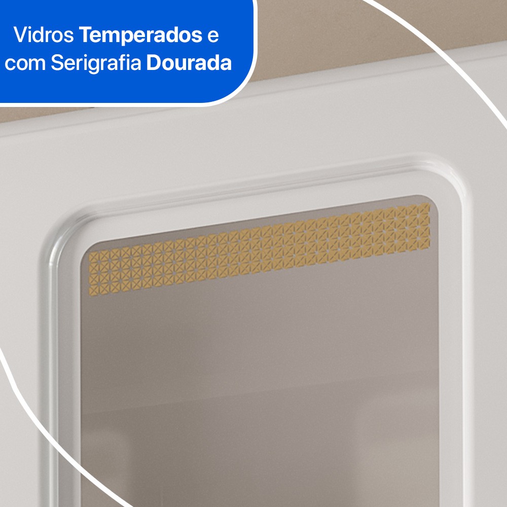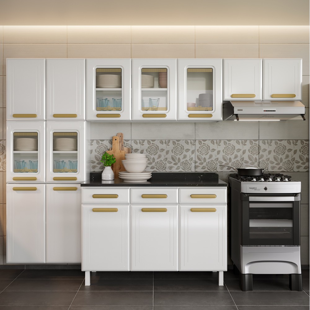 A Cozinha Ágata é garantia de muita durabilidade e beleza para o lugar mais querido da casa. Ela é desenvolvida com materiais de qualidade e oferece ótima capacidade de armazenamento, sendo todos os módulos muito funcionais. Aqui, é composta por quatro módulos: paneleiro duplo, armário triplo, armário duplo e balcão. Seus vidros são temperados e possuem delicadas serigrafias me harmonia com o desenho das portas. Os puxadores dourados, com acabamento recartilhado, também são um detalhe à parte. As três gavetas do balcão são equipadas com corrediças metálicas que deslizam de maneira eficiente. É um móvel amplo, fabricado todo em aço, e que recebe um revestimento eletrostático e anticorrosivo para garantir ainda mais durabilidade. O ambiente mais querido da casa merece a escolha certa: a Cozinha Ágata.
