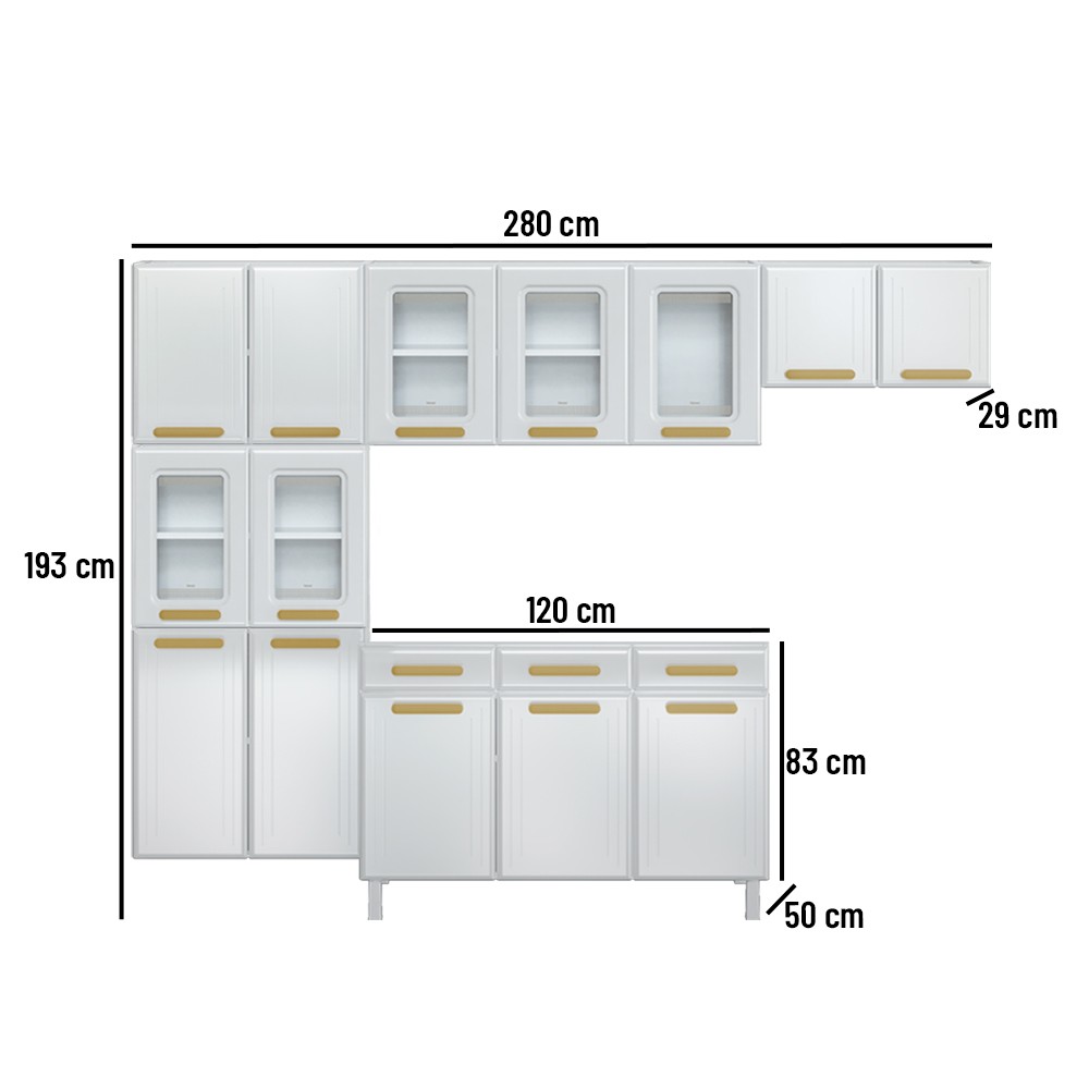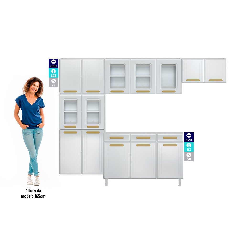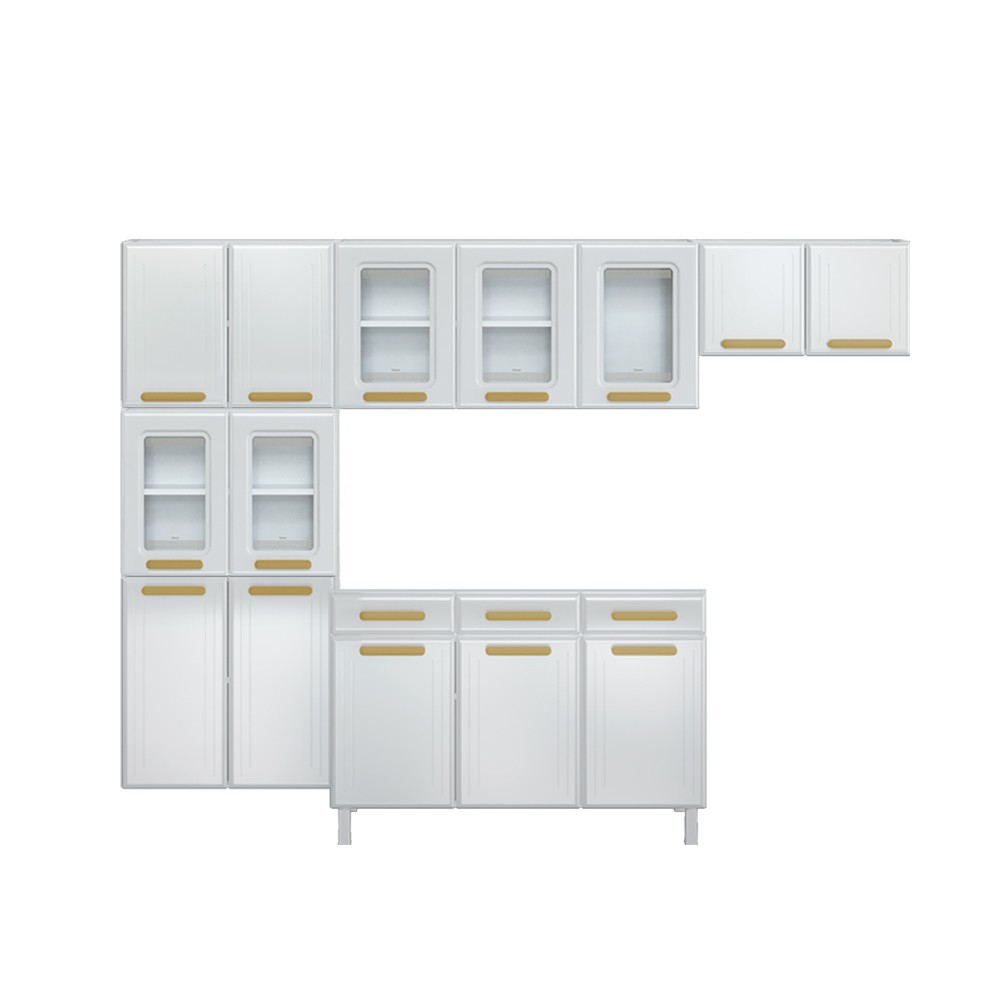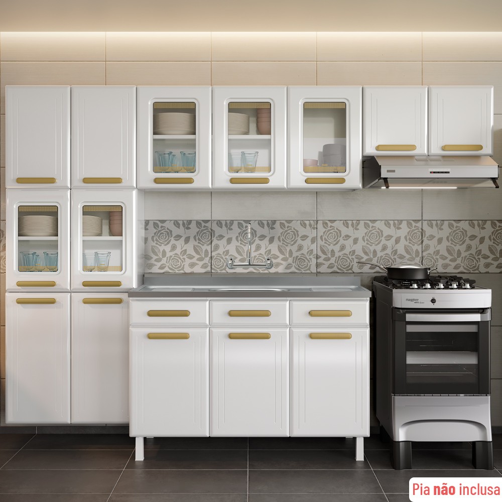 Uma cozinha resistente, funcional e visualmente encantadora: a Cozinha Ágata era o que faltava para aperfeiçoar a sua rotina no ambiente mais querido da casa. Fabricada em aço, ela passa por um rigoroso processo de revestimento eletrostático e anticorrosivo, que lhe garante uma maior durabilidade. Aqui, ela é composta por quatro módulos, que oferecem excelente espaço para a organização de panelas, mantimentos, eletros e muito mais. Além da qualidade, os detalhes dessa cozinha também merecem destaque: vidros temperados e adornados com elegantes serigrafias em harmonia com o design das portas e puxadores dourados com acabamento em estilo recartilhado, adicionam um toque de sofisticação. O balcão para pia - elemento essencial para o preparo, limpeza e organização, é espaçoso e equipado com gavetas que possuem corrediças metálicas. Não procure mais, a Cozinha Ágata é a escolha ideal para a sua casa, garantindo qualidade e estilo incomparáveis. Aproveite para adquiri-la agora e transformar sua cozinha em um ambiente de beleza e funcionalidade.