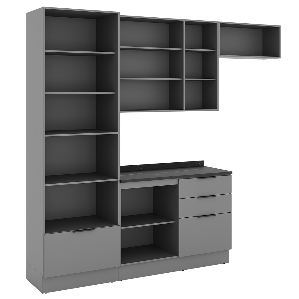 A cozinha Lumina foi desenvolvida para quem busca um visual contemporâneo aliado à praticidade no dia a dia. Com 2,40 m de altura, o conjunto apresenta acabamento em lacca, rodapé em PVC e um design sofisticado, evidenciado pelo contraste entre o cinza intenso da estrutura e o cinza claro das portas. Composta por quatro módulos, oferece excelente aproveitamento do espaço interno e múltiplas possibilidades de composição, facilitando a organização da cozinha. A qualidade dos acabamentos se destaca com dobradiças de 35 mm com amortecimento, corrediças telescópicas com extração total e puxadores slim em alumínio preto, que reforçam a estética moderna do conjunto. O balcão conta com 97 cm de altura e acompanha tampo, proporcionando mais conforto, ergonomia e praticidade para o preparo das refeições. O paneleiro possui espaço dedicado para forno e micro-ondas, além de portas de vidro fumê com iluminação interna integrada, agregando sofisticação, funcionalidade e valorizando o ambiente. A cozinha Lumina é a escolha ideal para quem valoriza design, qualidade e eficiência, com pronta entrega para transformar sua cozinha com rapidez e estilo.