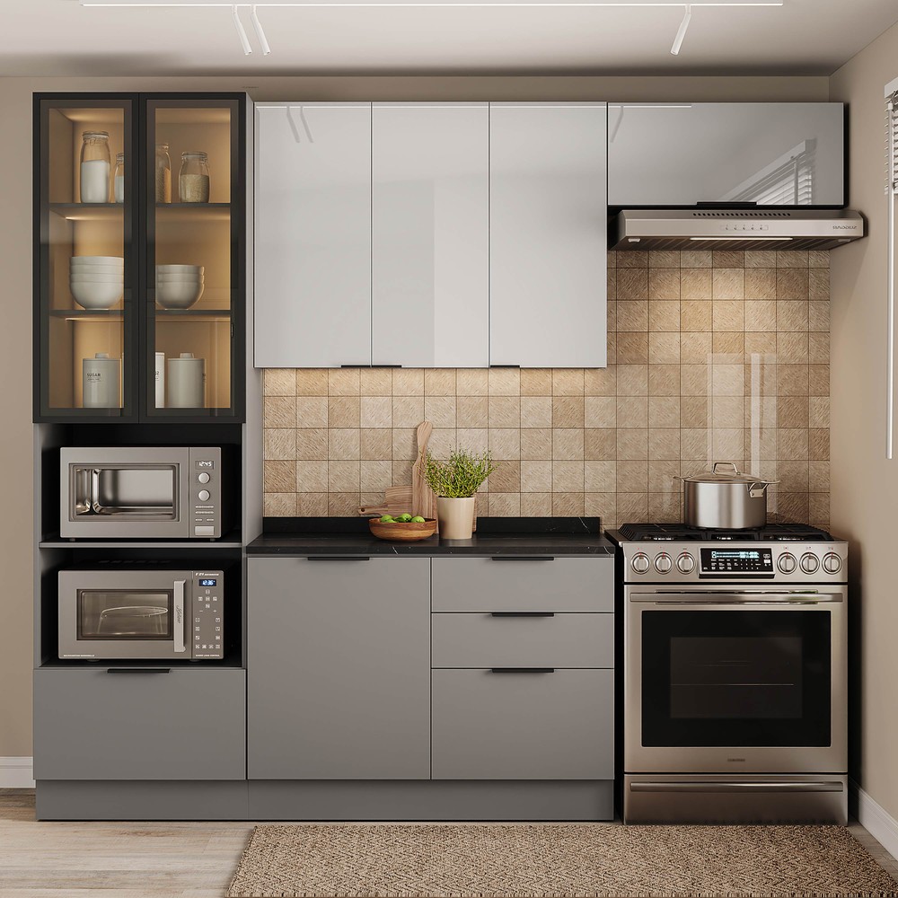 Cozinha Telasul Lumina 4 Peças Com Paneleiro para Forno e Micro Com Vidro fumê e Iluminação Cinza/Lacca