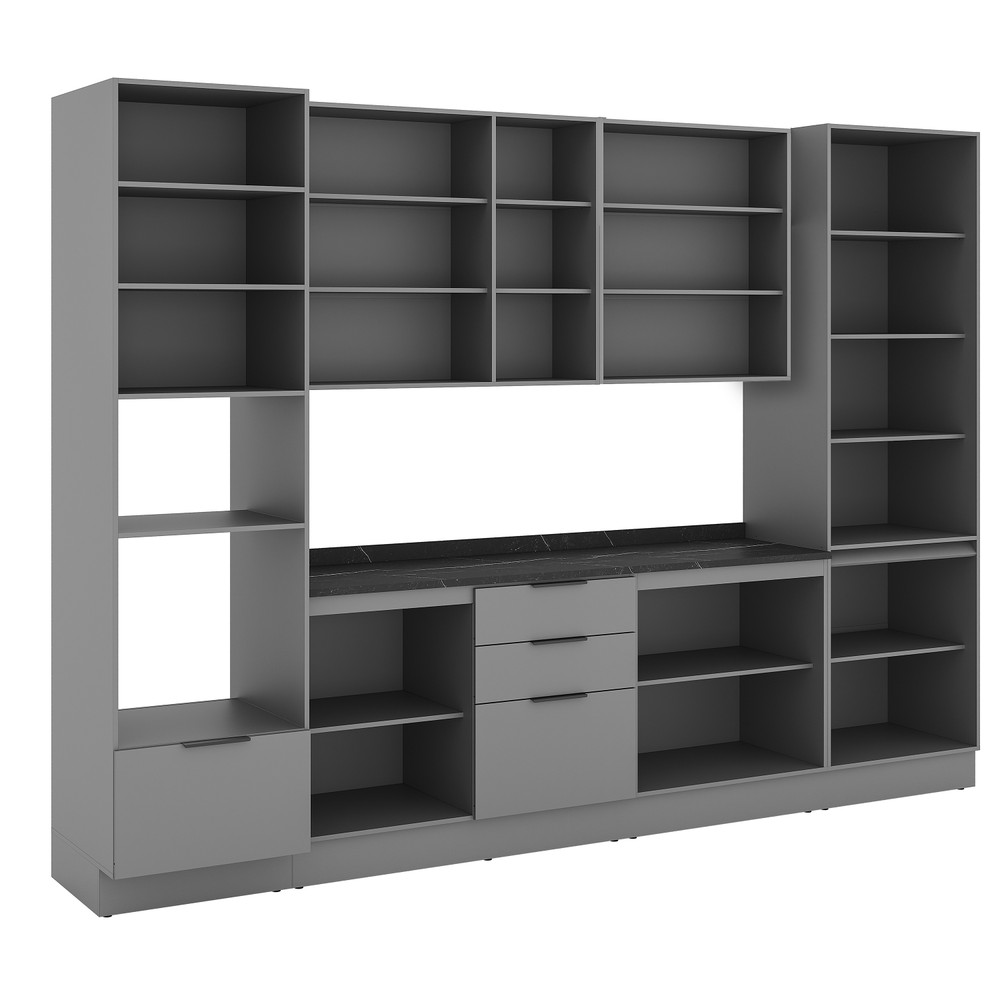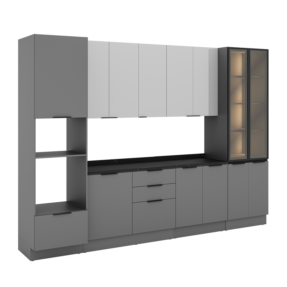 A cozinha Lumina apresenta um projeto contemporâneo que une funcionalidade, elegância e excelente aproveitamento de espaço. Com 2,40 m de altura, o conjunto conta com acabamento em lacca, rodapé em PVC e um visual sofisticado, marcado pelo contraste entre o cinza intenso da estrutura e o cinza claro das portas. Composta por seis módulos, oferece ampla capacidade de armazenamento e flexibilidade na composição, facilitando a organização da cozinha no dia a dia. A qualidade construtiva se evidencia nos detalhes, como dobradiças de 35 mm com amortecimento, corrediças telescópicas com extração total e puxadores slim em alumínio preto, que reforçam o estilo moderno do conjunto. O balcão possui 97 cm de altura, garantindo conforto e ergonomia no uso diário. O paneleiro com espaço dedicado para forno e micro-ondas complementa a composição com praticidade, enquanto o segundo paneleiro conta com portas de vidro fumê e iluminação interna integrada, agregando sofisticação, leveza visual e valorizando o ambiente. A cozinha Lumina é ideal para quem busca design, qualidade e praticidade, com pronta entrega para transformar sua cozinha com rapidez.